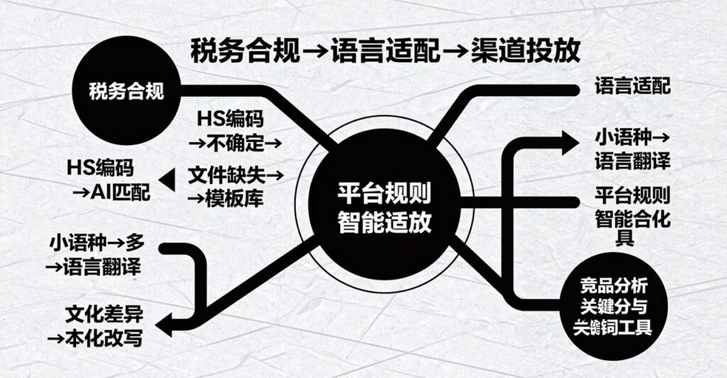 破解之道在于AI技术的深度赋能。首先,**智能财税翻译引擎**可实现“术语级”合规表述。该引擎对接最新海关与IRS政策数据库,准确解析HS编码,自动生成包含UN危险品申报、最新税率及海运要求在内的标准化英文税务文件,将申报错误率压缩至0.3%,并将传统8小时人工处理流程缩短至45分钟。其自动更新的政策库,确保卖家永不掉队。